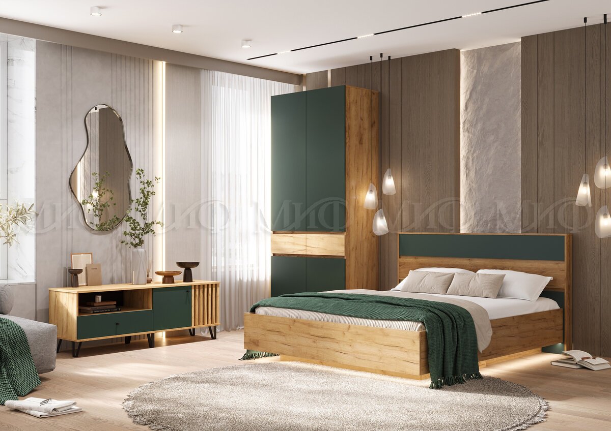 Спальный гарнитур Роджина крафт/изумрудный, модульный (Миф)